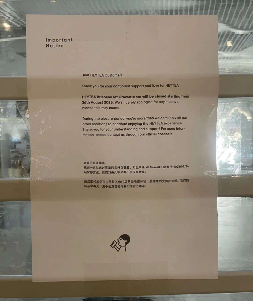 布里斯班 Garden City 喜茶门店,在昨天还正常营业的情况下,今天突然关门闭户,门口张贴通知: