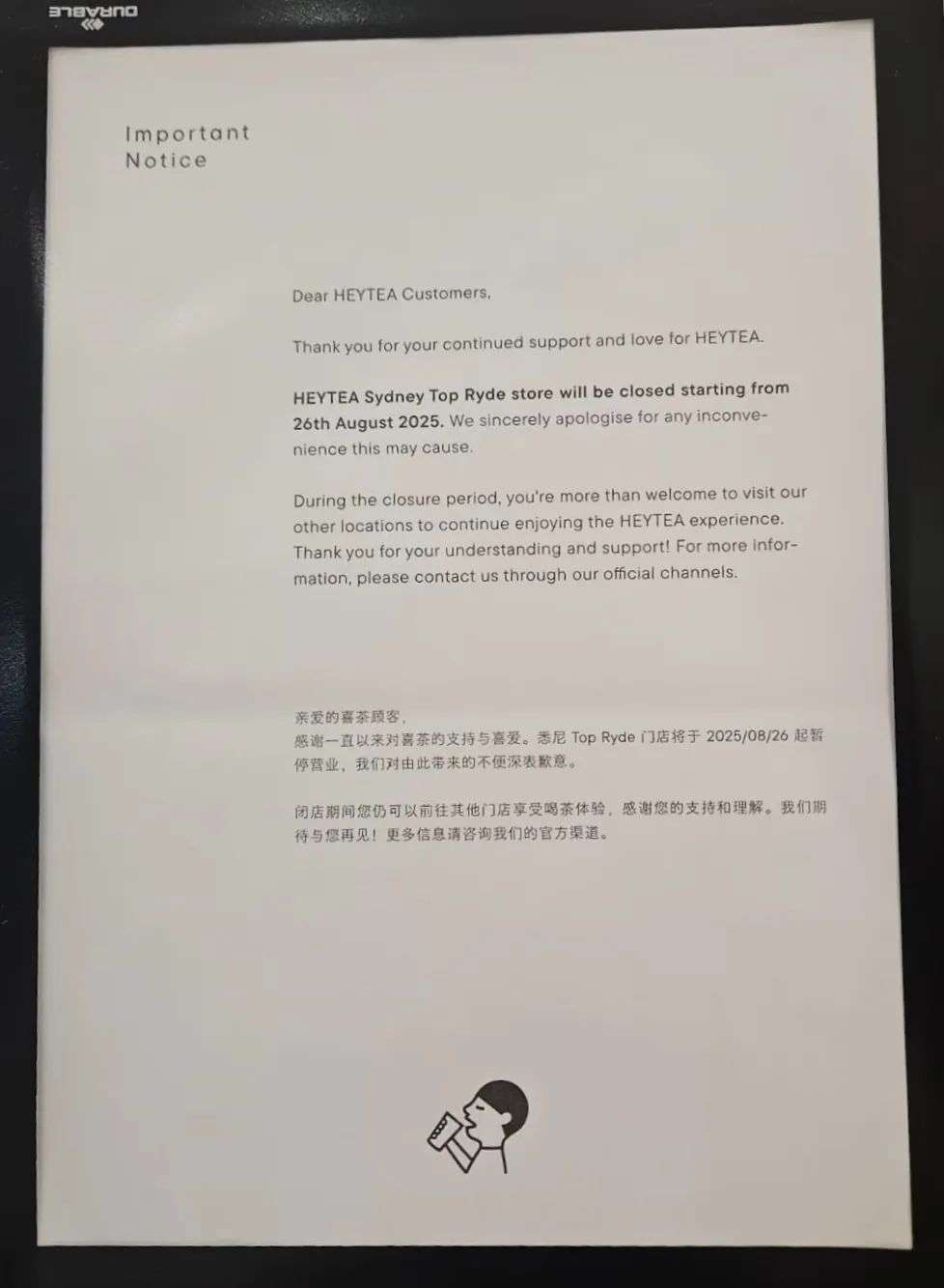 悉尼 Top Ryde 喜茶 也在今天发布公告,宣布暂停营业;