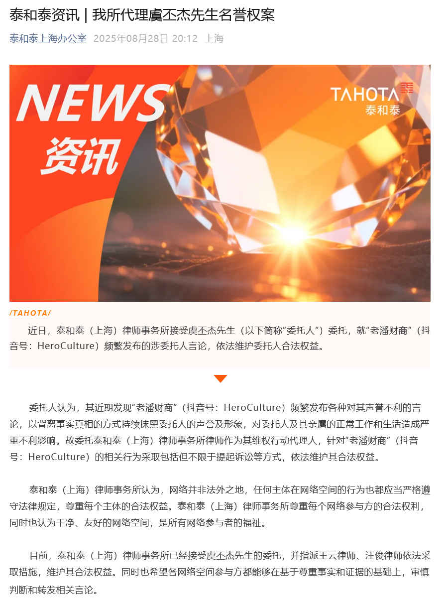 8月28日,泰和泰(上海)律师事务所发文称:“近日,泰和泰(上海)律师事务所接受虞丕杰先生委托,就“老潘财商”频繁发布的涉委托人言论,依法维护委托人合法权益。”