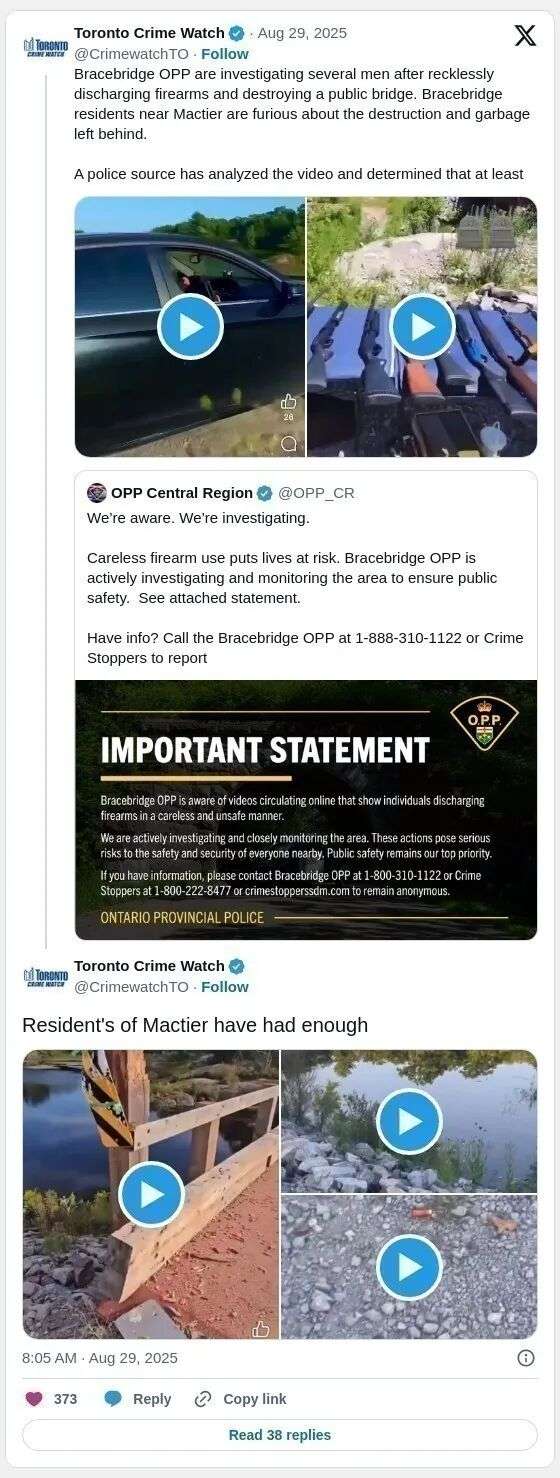 加拿大安省布雷斯布里奇(Bracebridge)警方正在调查数名男子,鲁莽开枪并摧毁一座公共桥梁。