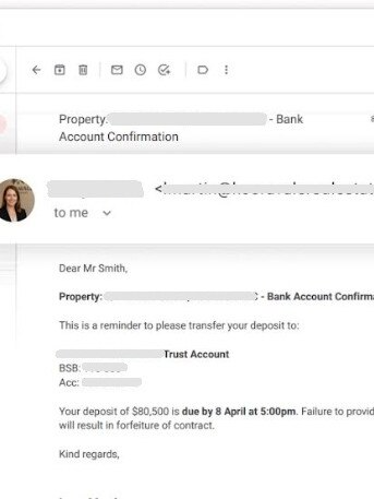 澳洲有一位退休买家收到伪造的律师邮件,要求她提前两周支付80万澳元的房款,银行账户也被换成了骗子的。