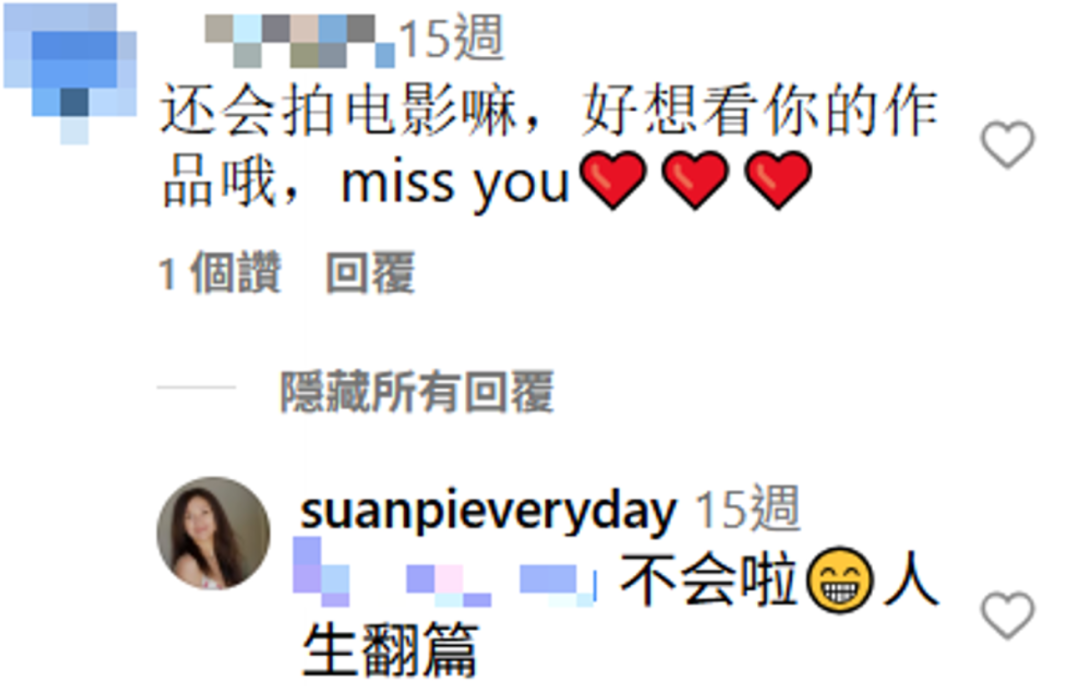 至于徐静蕾是否会重回幕前,她今年5月就亲自回复网友称:“不会啦,人生翻篇”,透露对演艺圈已经没有过多想法。
