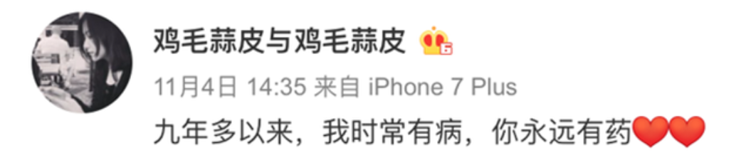 两人交往九周年时,徐静蕾在微博发文高调秀恩爱:“九年多以来,我时常有病,你永远有药”。