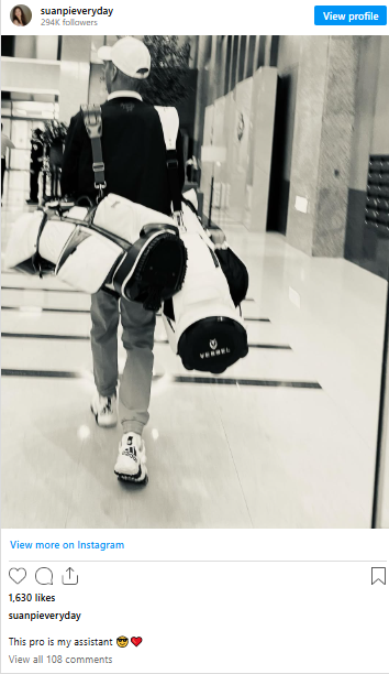视频中黄立行戴着黑色帽子、穿穿灰色短袖及深蓝色球裤,打扮非常休闲。