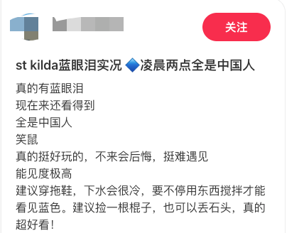“St Kilda蓝眼泪实况,凌晨两点全是中国人。真的有蓝眼泪,不来会后悔,挺难遇见,能见度极高!”