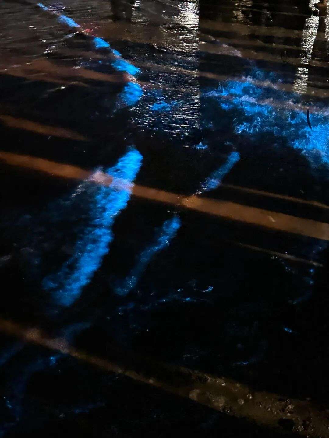 “昨晚上看到帖子立刻冲去St Kilda pier,走到比较黑的桥那边开始洒水,结果真的有!肉眼特别特别蓝,手机还能拍出来!”