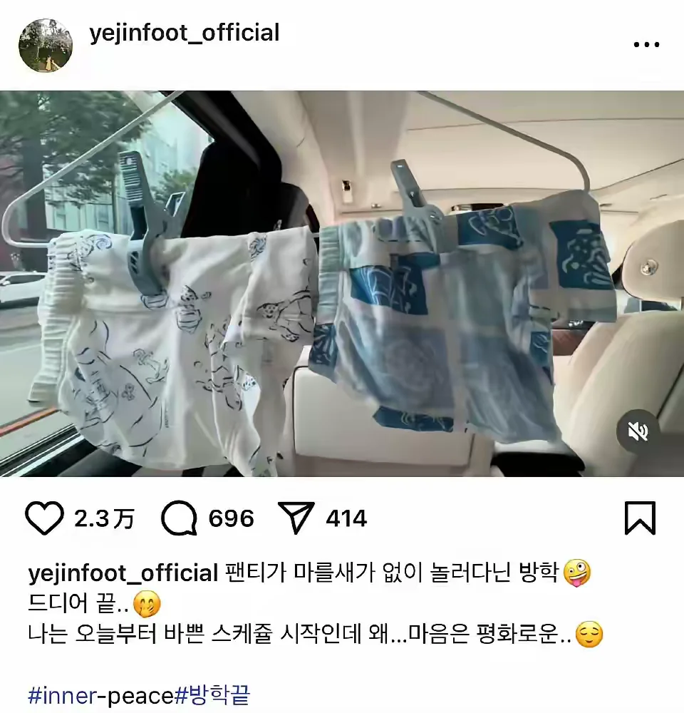 孙艺珍月初在ig上晒出两条晾在车内的内裤:出去玩内裤一直干不了的假期结束了,爸爸最辛苦了……