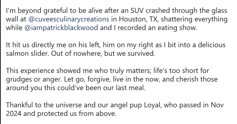 这起事故发生在德州休斯敦的CuVee's Culinary Creations 餐厅,知名博主Nina Unrated与同为网红的前男友Patrick Blackwood正在这里拍美食测评视频。