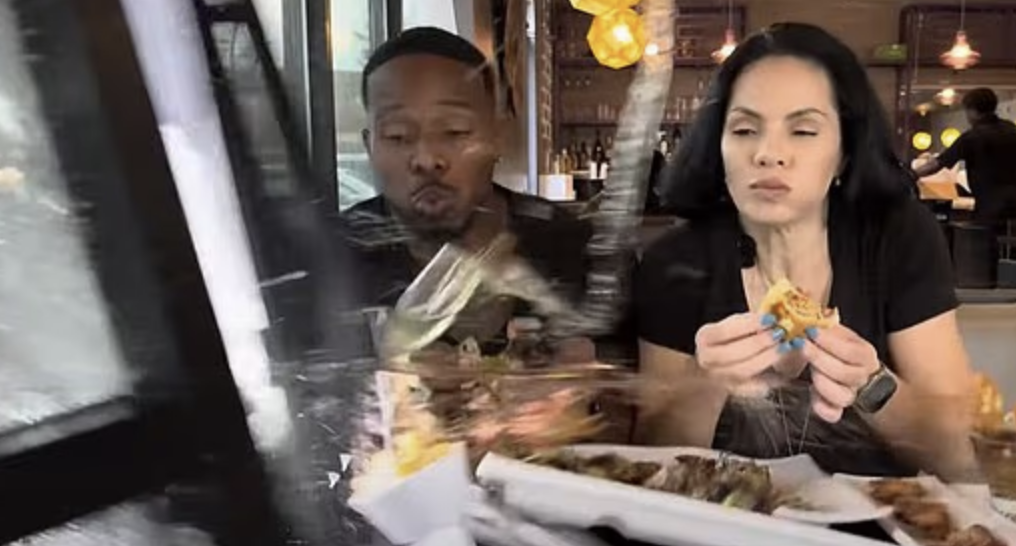 作为网红的两人也很敬业,举起汉堡“碰杯”,仪式感满满,没想到他们刚咬下一口,意外发生了——一辆SUV以每小时约35至40英里的速度,直冲餐厅玻璃,瞬间将二人掀翻!玻璃碎片四溅,现场一片混乱。
