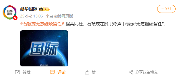 9月2日,据共同社,石破茂在辞职呼声中表示“无意继续留任”。