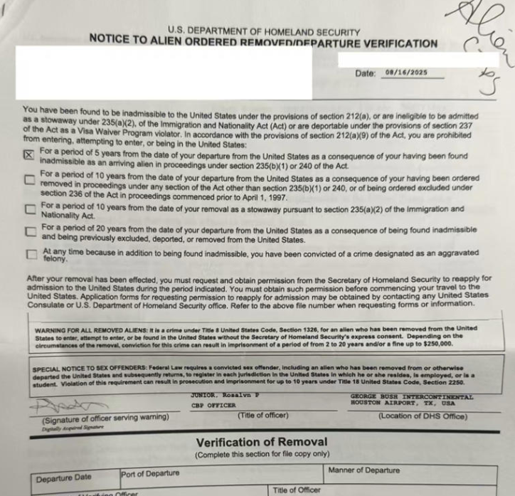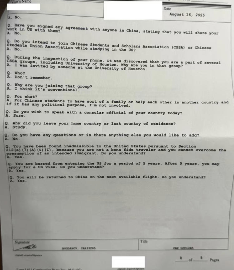手续齐全、拿着全额奖学金,本该是前途无限的学术之路,却在落地休斯敦的36小时里戛然而止。22岁的中国留学生顾同学,被关进“小黑屋”、连续盘问10小时、彻夜不眠……最后,他带着一纸写着“文件不充分”的遣返令,被原机送回中国,还被禁入美国长达五年。