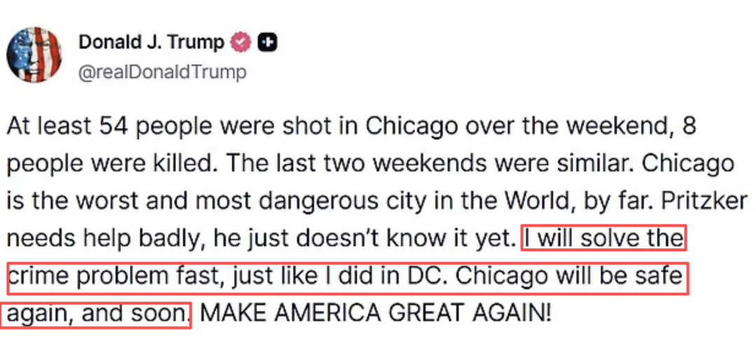 他刚刚说话了:“芝加哥是世界上最危险的城市,一个周末54人中弹、8人死亡!毫无疑问,软弱而可悲的州长需要帮助,但他还没意识到,拒绝了国民警卫队的帮助,现在我要出手了!”