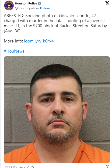 休斯敦警方已于9月2日正式逮捕42岁的 Leon Gonzalo Jr.,并以谋杀罪起诉他。警方指出,案件发生时,孩子正在逃跑,射击发生在屋外,不构成“正当防卫”。嫌疑人目前被关押在哈里斯县监狱。