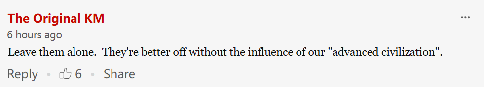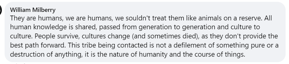 “他们是人,我们也是人,不该把他们当作保护区里的动物来圈定对待。人类所有的知识都是共通的,会在代际之间、文化之间传承。人类能够生存,文化也会发生变化(有时也会消亡),但不是所有文化都有“活”下来的方法。这个部落与外界有接触,并非是某种纯粹物质被玷污,也不是某种文明被破坏,这只是人类的本性(探索)与事物发展的必然规律而已。”