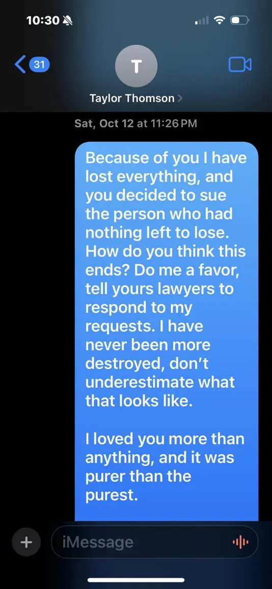 “因为你,我失去了一切。而你还要起诉一个已经一无所有的人。泰勒,我曾爱你胜过任何人和事,比纯粹更纯粹。”