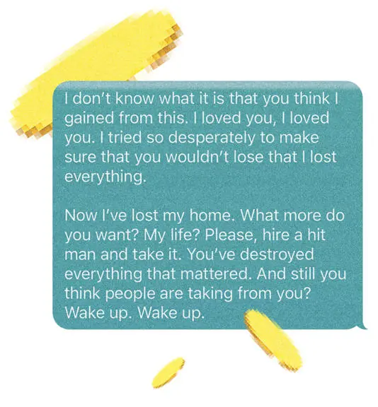 “我真的不懂你觉得我能从这一切里得到什么。我爱过你,我真的爱过你。我拼命想要帮你保住不赔,甚至把自己赔光了。
