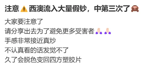 视频发布之后,不少澳洲其他地区的华人商家也表示,自己店里也收到了假币。更棘手的是,一旦假币进入现金循环,它可能会在二手交易、零散消费中继续流转,让更多人受到牵连。