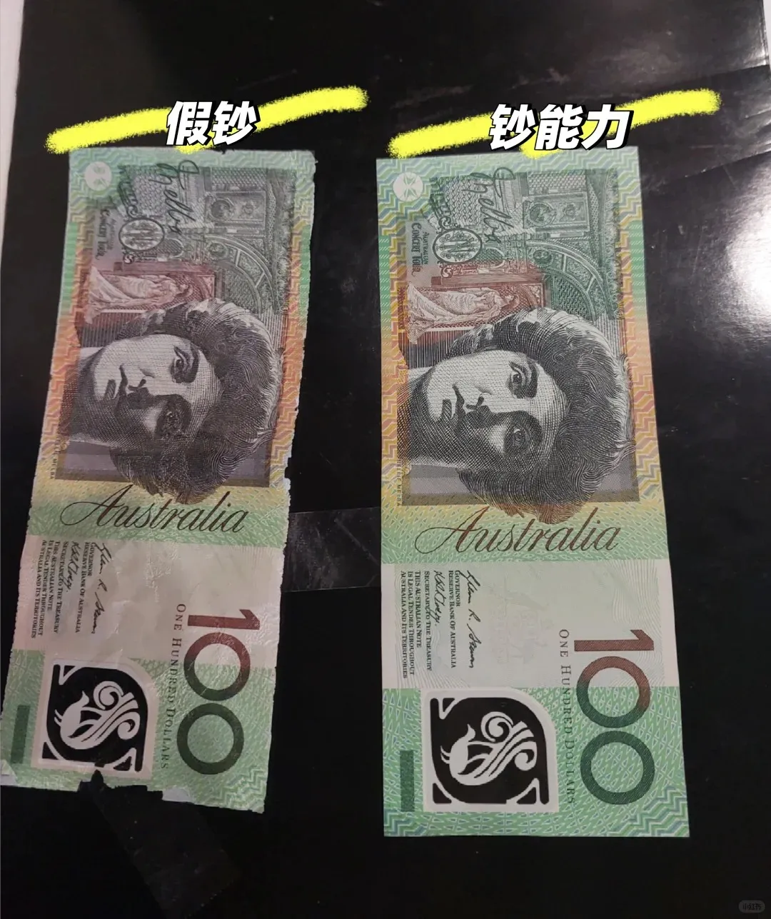 他还晒出了真假100澳元的对比图:左边的假钞边缘撕裂、印刷模糊、表面粗糙,而右边的真钞则色彩清晰、细节完整。
