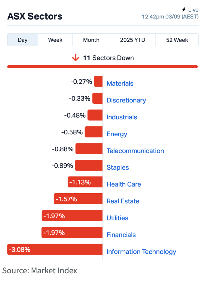 ASX今天午间重挫0.8%,11大板块无一幸免,科技股领跌。美债收益率高企,美股昨夜承压,“七巨头”领跌,澳洲本地科技股Xero、Life360、WiseTech也跟着跳水。 GDP数据略超预期,二季度增长0.6%,但仍难挽颓势。外界原本期待9月可能降息,但现在几乎已被排除。黄金再成避风港,突破每盎司3530美元创历史新高!数据显示,全球央行正在抛售美债、加码黄金,给“山姆大叔”投出一张不信任票。