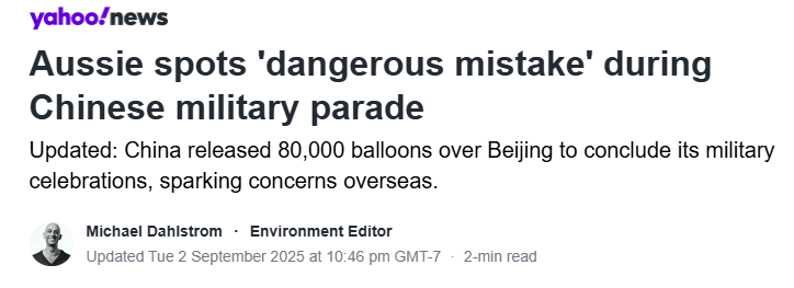 除了吐槽Daniel Andrews参加阅兵仪式之外,澳洲境内对于这次阅兵也有不少讨论。其中有一些观点十分清奇,比如说澳洲的环保主义者就表示,中国阅兵仪式上放飞数万气球的行为不可取...