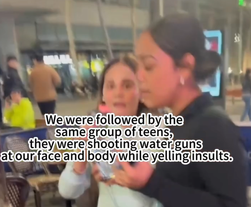 她说,离开警局后,大约是晚上8点20分,那群少女开始尾随她和朋友,一边用水枪喷射,一边辱骂他们。