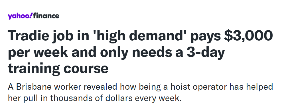 根据澳洲就业与技能局(Jobs and Skills Australia)的数据,目前全国从事“吊机、升降机及提升机操作”的工人约有1.5万人,他们的周薪中位数高达$3031。