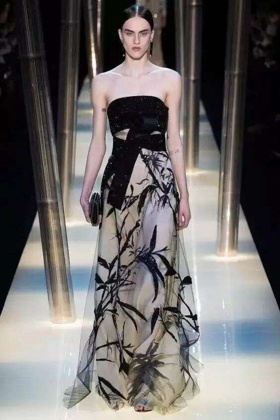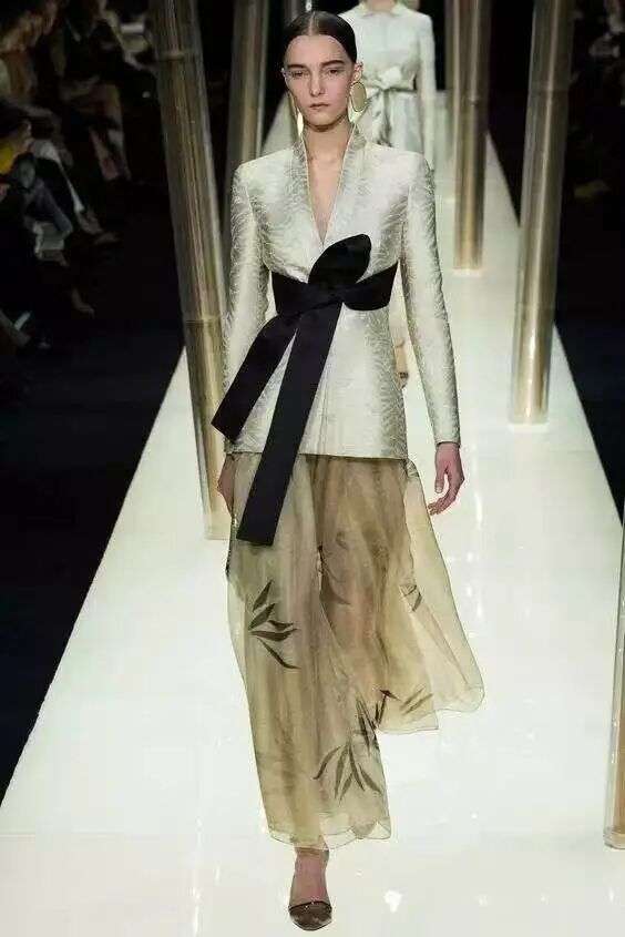 乔治·阿玛尼 (Giorgio Armani)2015 Couture 高定大秀以东方,具体来说是中国风为灵感,抛掉了龙凤旗袍青花瓷的中国元素,以作为士大夫身份名片的竹元素、汉唐式的襦裙、苏绣与珐琅掐丝,借助西方时装屋高级手工坊的精妙绝伦的工艺,尽展清风峭骨。