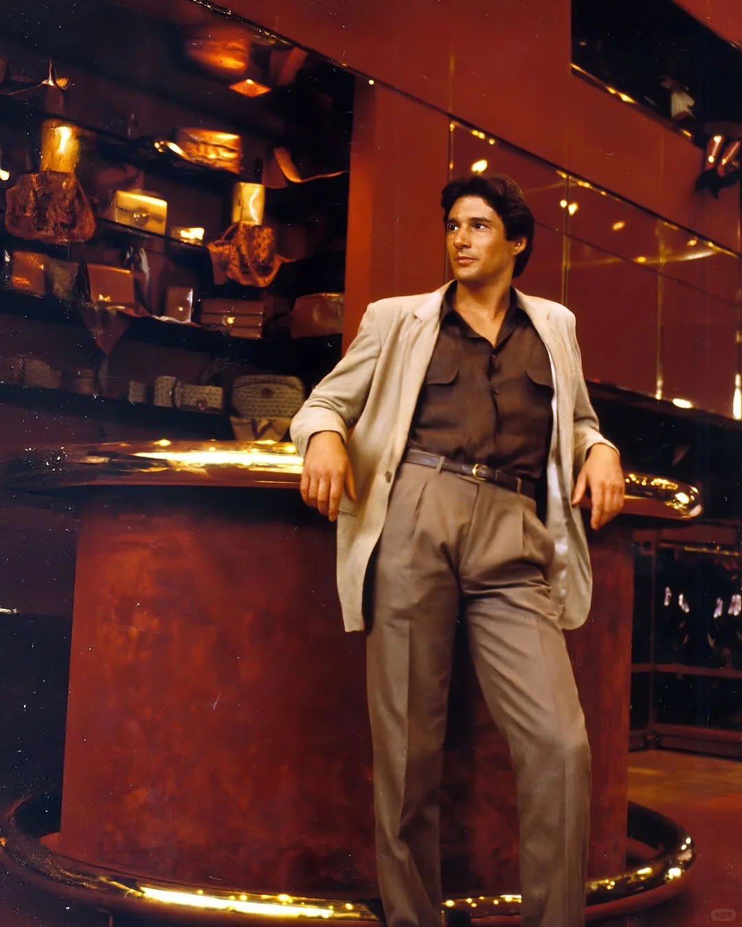 1980年,阿玛尼参与了理查·基尔主演的《美国舞男》的服装设计与制作。主角李察·基尔身着的权力套装向全世界展示了“毫不费力的性感”,也让阿玛尼品牌在好莱坞受到追捧。此后他为超200部电影设计过服装。