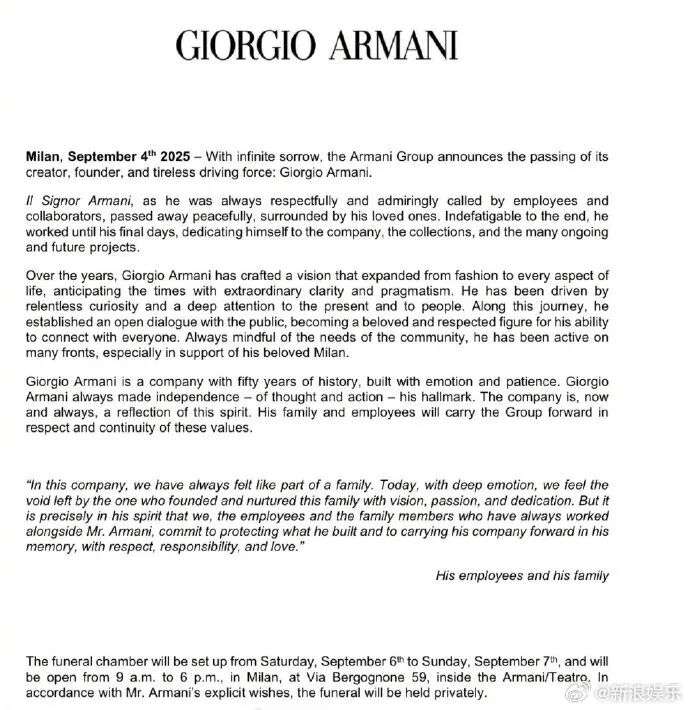 阿玛尼于当地时间本周四在家人的陪伴下在家中安详去世。阿玛尼集团今天发布了一份声明,“无限悲痛”地宣布了他去世的消息。