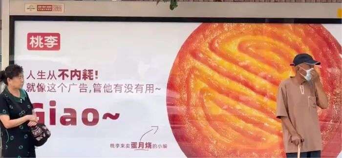 其他广告也大量运用网络热梗。比如用“人生从不内耗!…管他有没有用~Giao~”来做反向营销,还有虚构“千金大小姐来桃李打工卖月饼”的“社畜小说”,以及在沈阳本地使用东北方言和表情包的尝试。