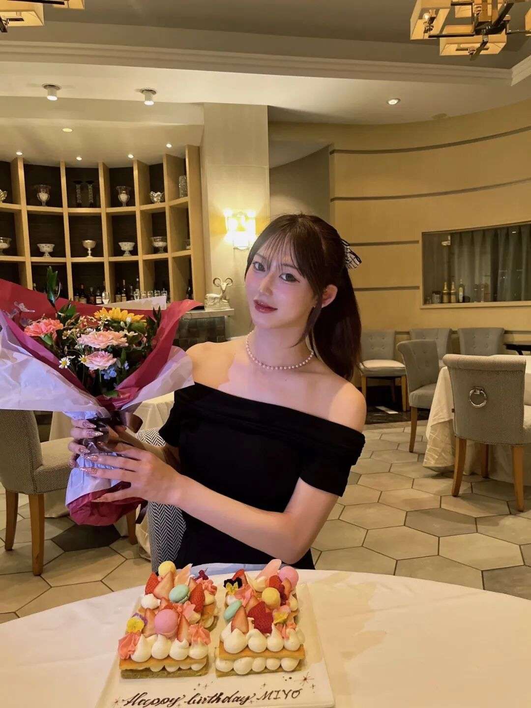 她画着淡妆,穿着黑色露肩礼裙,手捧鲜花,对着镜头微微一笑,整个人精致又漂亮。