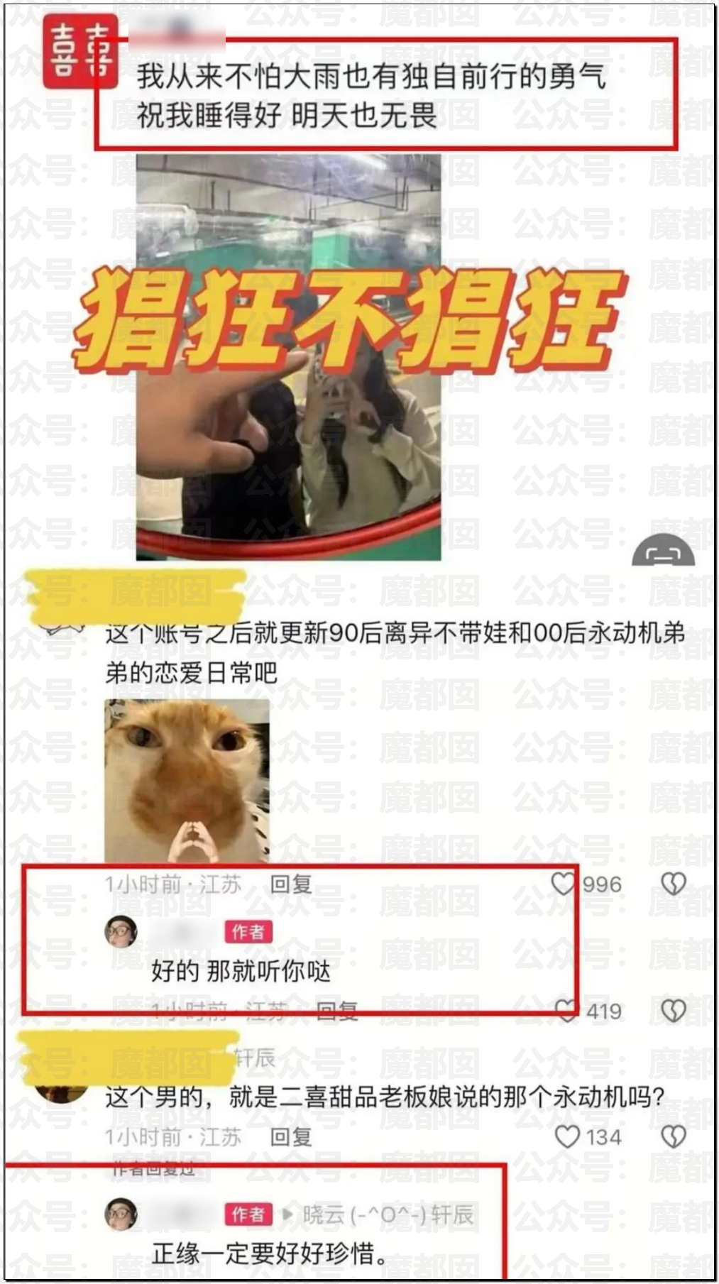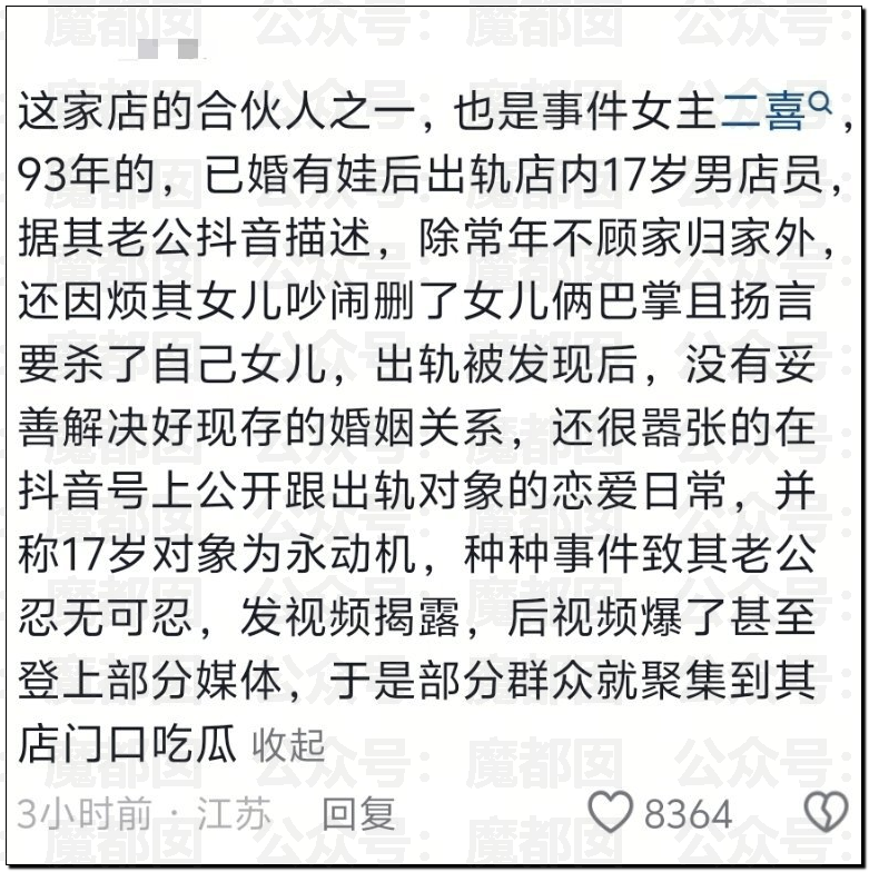 接下来说个很多人都在问我们的那个所谓的“二喜”甜品店老板娘出轨的事情。