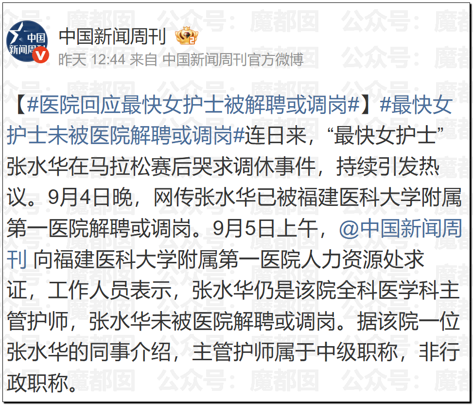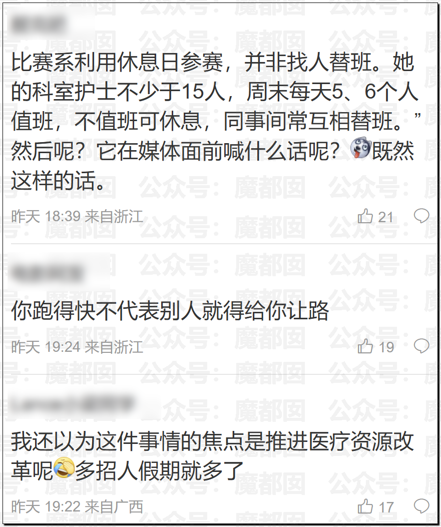 对于网友的争议,张水华丈夫王岢在接受媒体采访时称,8月31日的比赛系利用休息日参赛,并非找人替班。她的科室护士不少于15人,周末每天5、6个人值班,不值班可休息,同事间常互相替班。王岢称,跑本次马拉松不为赚钱,签约“MCN”是为参赛名额。网传内容不完整、妻子言语表述有误才引发误解。