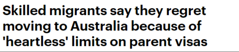大批想要父母来澳洲团聚的澳洲移民都吐槽,澳洲是一个冷血无情的国家,特别是澳洲重视的技术移民们,对父母签证等待期过长这一点非常不满。