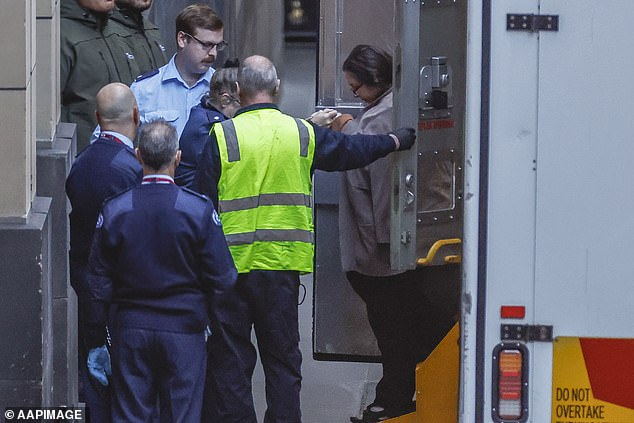 Erin Patterson在两名安保人员的护送下缓慢走入法庭。她身穿一件花纹上衣和棕色外套,神情异常平静,几乎看不出情绪波动。