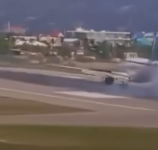 现场的画面显示,这架飞机降落在跑道的瞬间,疑似“弹跳”,紧接着滑出跑道!