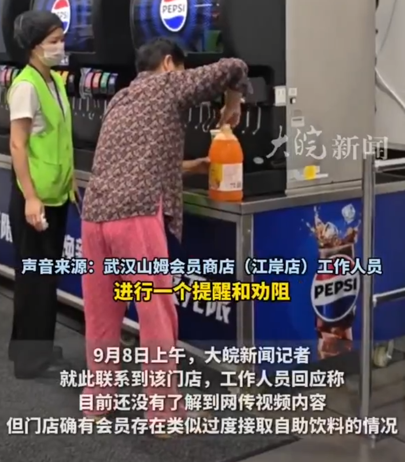 事件发生在武汉江岸区的山姆会员店。据传拍摄时间是9月7日,视频中,这位大妈拎着的塑料桶约有5升容量,面对自助饮料机毫不犹豫地接满。期间,门店员工多次出面劝阻,但女子依旧坚持“灌满才走”。