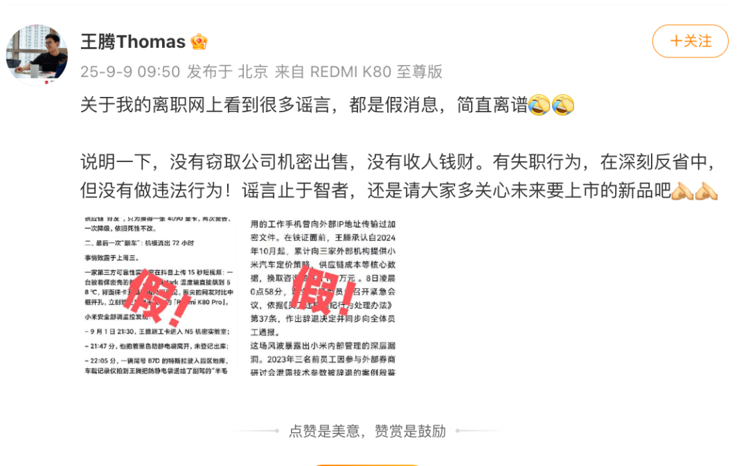 9月9日,@王腾Thomas 发文辟谣,称没有窃取公司机密出售,没有收人钱财。全文如下: