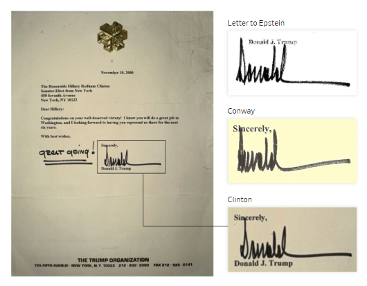 特朗普写给律师康威(George Conway)和美国前国务卿希拉里·克林顿(Hillary Clinton)的信中也使用了类似的签名 华尔街日报