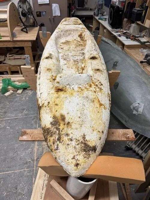 一切完毕后,他得到了一艘触感粗糙、表面凹凸不平的棕黄色“蘑菇船”,重量足足有61公斤。