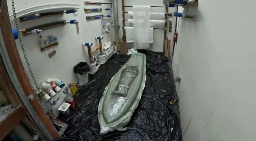 第一步是打造模具,他把某品牌一款近4.3米长的平台舟当做模板,制作了玻璃纤维模具: