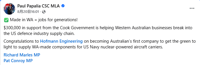 库克政府提供 30万澳元资金支持,助力西澳企业打入美国国防工业供应链。热烈祝贺 Hofmann Engineering 成为澳大利亚首家获批向美国海军核动力航空母舰供应西澳制造零部件的企业!