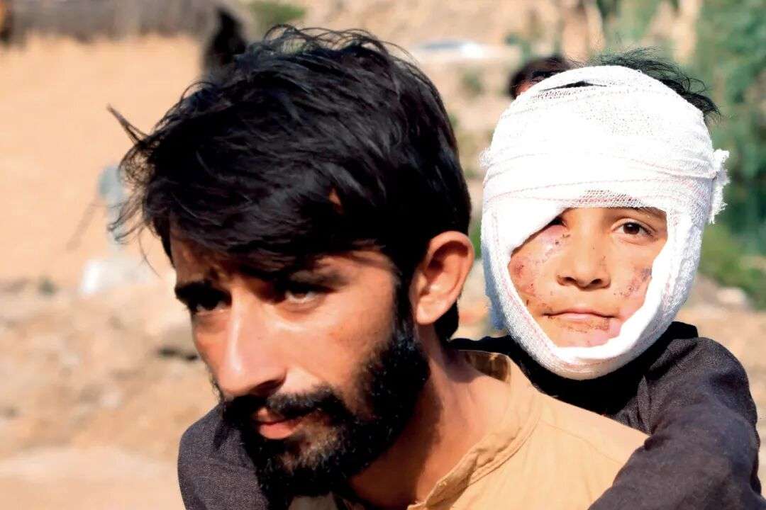 9月4日,阿富汗库纳尔省努尔加尔,一名男子背着受伤的孩子。图/新华