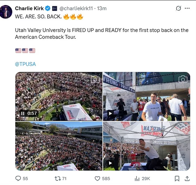 这次枪击事件发生时,他正站在台上与学生互动,几分钟前他还在社交媒体上写下“Utah Valley University is fired up and ready”,表达对巡回演讲的兴奋。