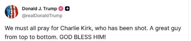 这起枪击案立刻引发美国政坛跨党派的高度关注。总统川普在 Truth Social 上发文,呼吁全国为 Charlie Kirk 祈祷,称他是一个“伟大的人”。