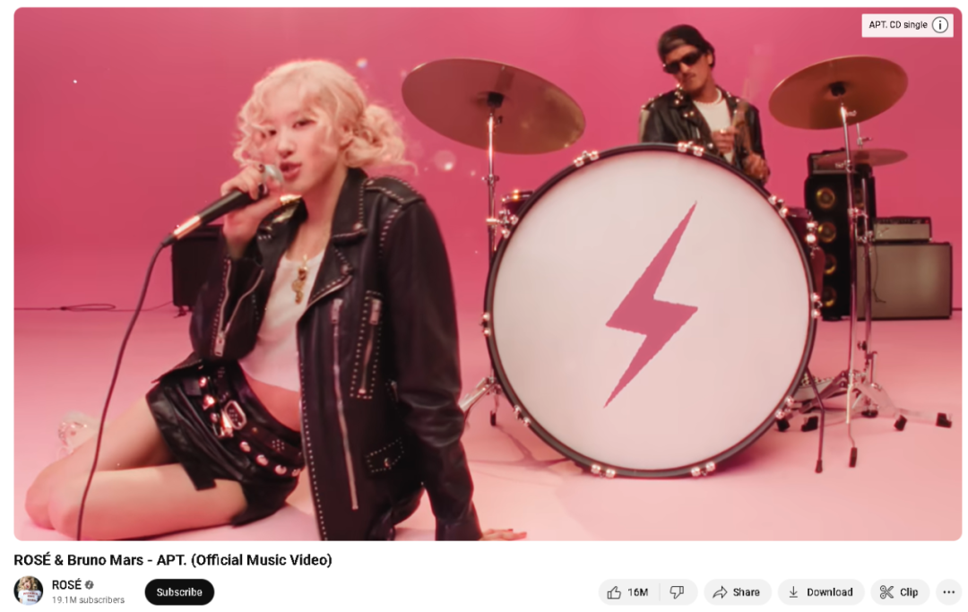 刚刚传来消息,K-pop 巨星 Rosé 和 Bruno Mars 合作的单曲 《APT》 在纽约 MTV 音乐录影带大奖上拿下了“年度歌曲”大奖。