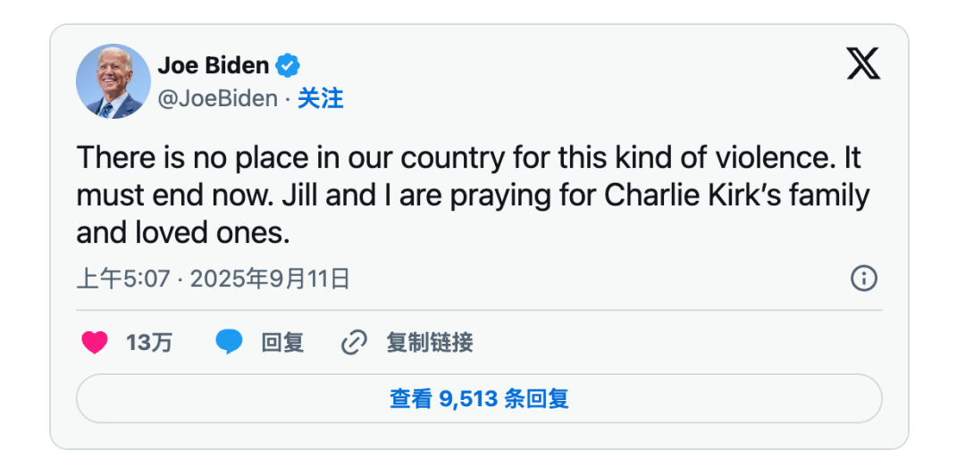 前总统拜登表示:"我和 Jill 正在为Charlie Kirk的家人和亲人祈祷。在我们国家,这种暴力没有容身之地。它必须现在结束。"
