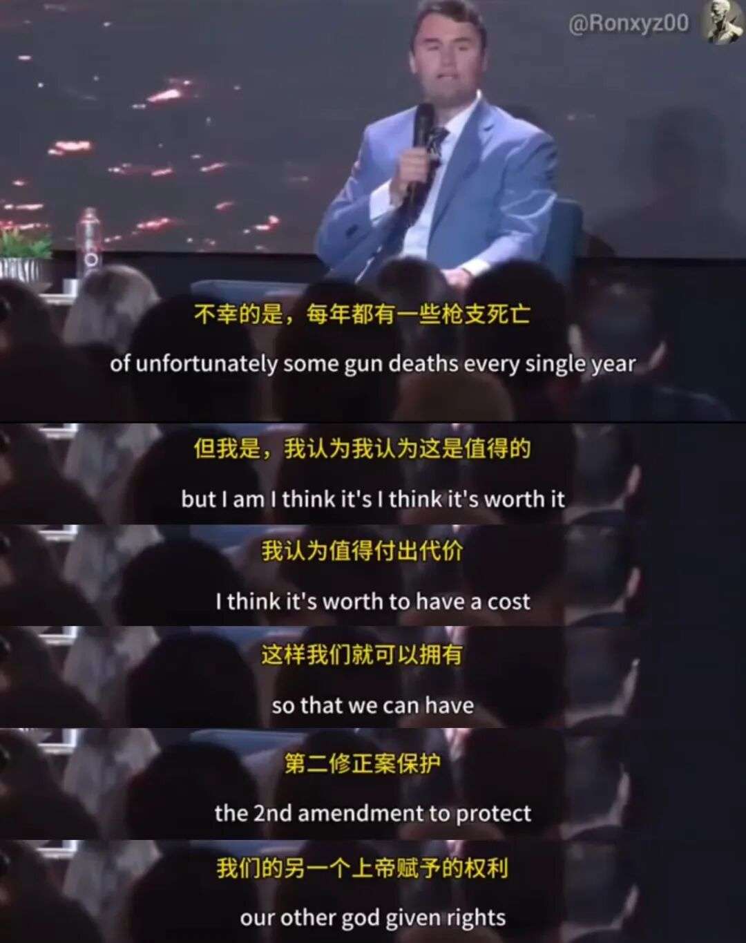 随后观众追问"过去10年美国到底有多少大规模枪击案凶手",Kirk反问道"是否计算帮派暴力"——就在此时,枪声响起。