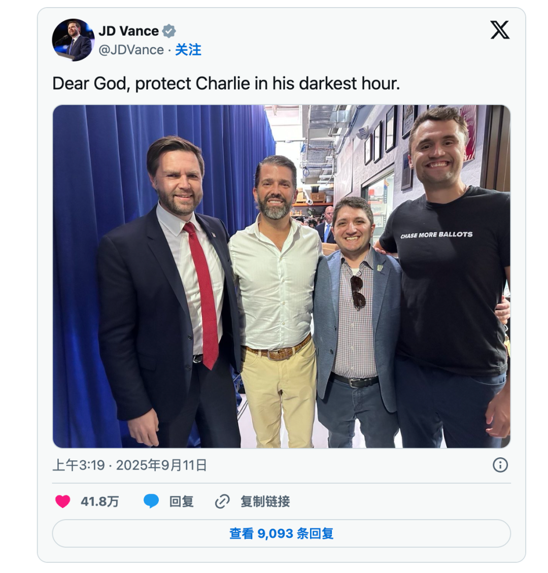 "又一次,一颗子弹让一个时代最雄辩的真相诉说者沉默了。我亲爱的朋友Charlie Kirk是我们国家为言论自由而不懈勇敢奋斗的勇士。"