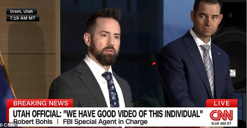 案发不足24小时,FBI 盐湖城办公室紧急召开发布会,公布了一名“感兴趣人物”的监控照片:黑衣、墨镜、鸭舌帽,胸前疑似印有美国国旗标志。